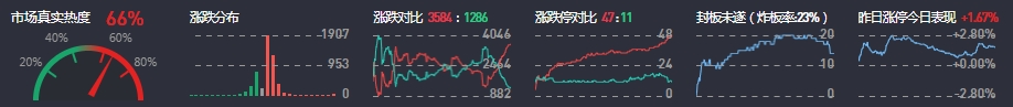 3、两市共3584只个股上涨,47只个股涨停,1286只个股下跌,11只个股跌停,11只股票炸板,炸板率23%。