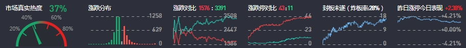 3、两市共1576只个股上涨,43只个股涨停,3391只个股下跌,11只个股跌停,13只股票炸板,炸板率28%。