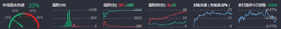 3、两市共527只个股上涨,36只个股涨停,4502只个股下跌,13只个股跌停,12只股票炸板,炸板率32%。