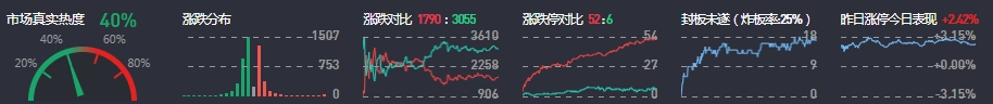3、两市共1790只个股上涨,52只个股涨停,3055只个股下跌,6只个股跌停,14只股票炸板,炸板率25%。