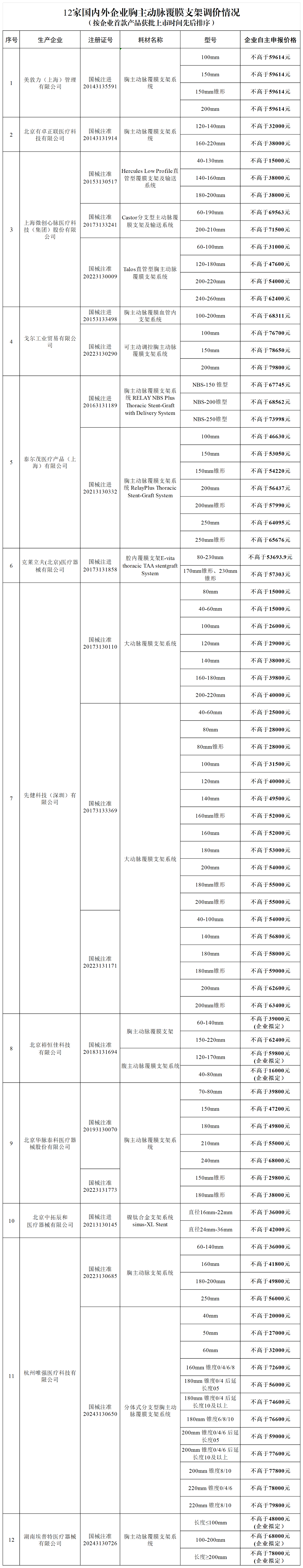 国家医保局:12家国内外企业重新制定胸主动脉覆膜支架产品价格 国家医保局8月26日发文称,近期,社会广泛关注胸主动脉覆膜支架调价情况,现将企业自主申报的最新终端挂网价格情况整体公开,供大家参考。根据国家医保局公开的价格情况,企业自主申报价格最高为不高于7.98万元,最低为不高于1.5万元。 风险提示及免责条款 市场有风险,投资需谨慎。本文不构成个人投资建议,也未考虑到个别用户特殊的投资目标、财务状况或需要。用户应考虑本文中的任何意见、观点或结论是否符合其特定状况。据此投资,责任自负。