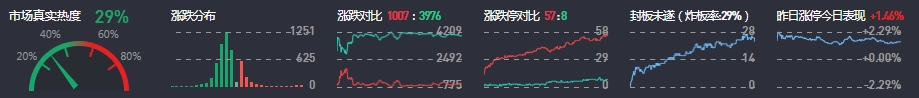3、两市共1007只个股上涨,57只个股涨停,3976只个股下跌,8只个股跌停,19只股票炸板,炸板率29%。