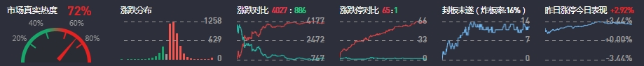 3、两市共4027只个股上涨,65只个股涨停,886只个股下跌,1只个股跌停,11只股票炸板,炸板率16%。