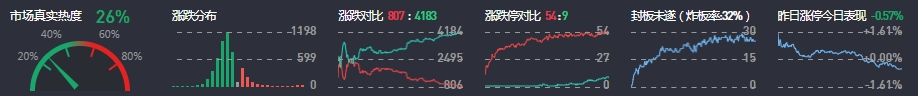 3、两市共806只个股上涨,54只个股涨停,4183只个股下跌,9只个股跌停,21只股票炸板,炸板率32%。