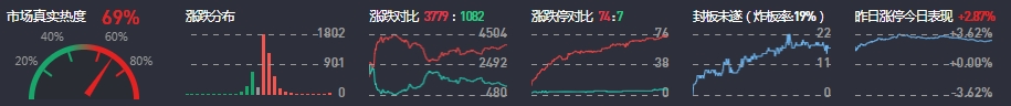 3、两市共3779只个股上涨,74只个股涨停,1082只个股下跌,7只个股跌停,13只股票炸板,炸板率19%。
