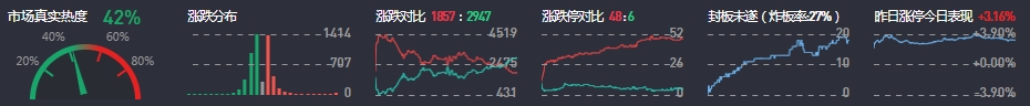 3、两市共1857只个股上涨,48只个股涨停,2947只个股下跌,6只个股跌停,13只股票炸板,炸板率27%。