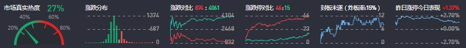 3、两市共874只个股上涨,46只个股涨停,4061只个股下跌,15只个股跌停,6只股票炸板,炸板率15%。