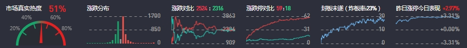 3、两市共2524只个股上涨,59只个股涨停,2316只个股下跌,18只个股跌停,16只股票炸板,炸板率23%。