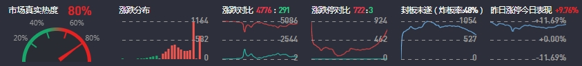 3、两市共4776只个股上涨,730只个股涨停,291只个股下跌,3只个股跌停,636只股票炸板,炸板率48%。
