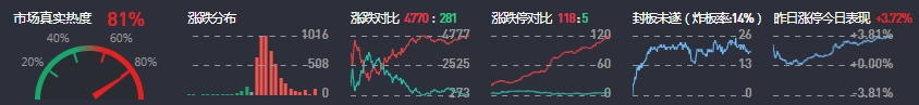 3、两市共4770只个股上涨,118只个股涨停,281只个股下跌,5只个股跌停,18只股票炸板,炸板率14%。