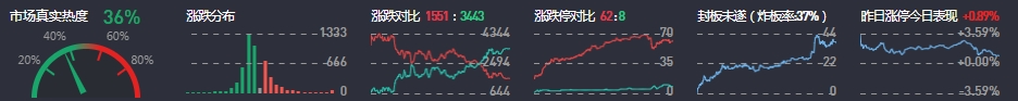 3、两市共1551只个股上涨,62只个股涨停,3443只个股下跌,8只个股跌停,36只股票炸板,炸板率37%。