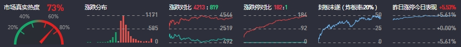 3、两市共4213只个股上涨,182只个股涨停,819只个股下跌,1只个股跌停,42只股票炸板,炸板率20%。