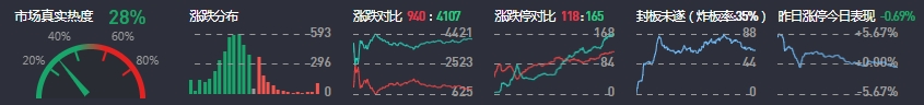 3、两市共940只个股上涨,118只个股涨停,4107只个股下跌,165只个股跌停,64只股票炸板,炸板率35%。