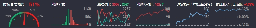 3、两市共2604只个股上涨,162只个股涨停,2349只个股下跌,7只个股跌停,77只股票炸板,炸板率34%。