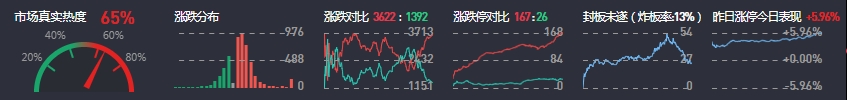 3、两市共3622只个股上涨,167只个股涨停,1392只个股下跌,26只个股跌停,25只股票炸板,炸板率13%。