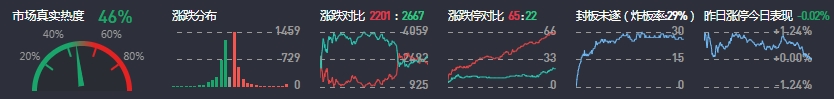 3、两市共2201只个股上涨,65只个股涨停,2667只个股下跌,22只个股跌停,21只股票炸板,炸板率29%。