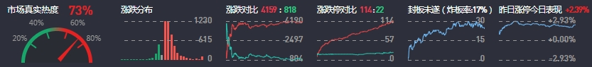 3、两市共4159只个股上涨,114只个股涨停,818只个股下跌,22只个股跌停,20只股票炸板,炸板率17%。