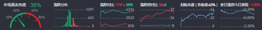 3、两市共1119只个股上涨,58只个股涨停,3898只个股下跌,8只个股跌停,25只股票炸板,炸板率43%。