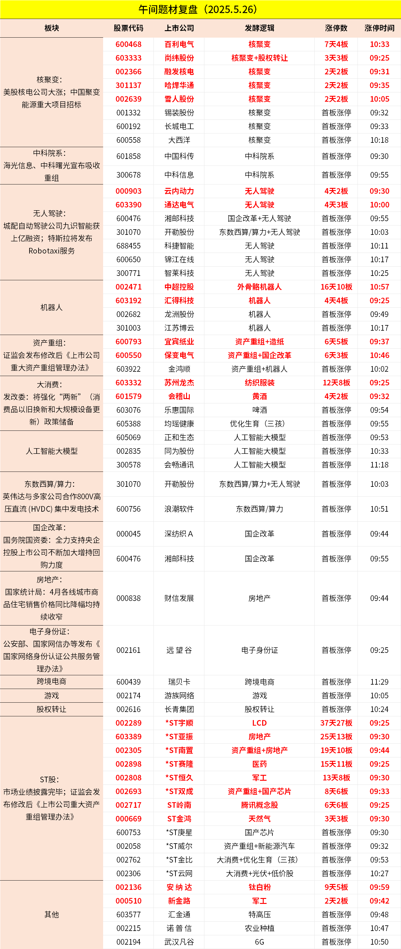 1、市场早间震荡调整,创业板指跌超1%。可控核聚变概念反复活跃,哈焊华通、雪人股份、百利电气、融发核电等涨停。IP经济概念股再度走强,远望谷、游族网络涨停。智能物流概念股集体大涨,湘邮科技等多股涨停。下跌方面,医药医疗股集体调整,海辰药业、科源制药跌超10%。个股涨跌互现,上午半天成交6611亿。午间收盘沪指跌0.3%,深成指跌0.71%,创业板跌1.28%。
