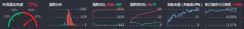 3、两市共4530只个股上涨,84只个股涨停,552只个股下跌,19只个股跌停,18只股票炸板,炸板率19%。