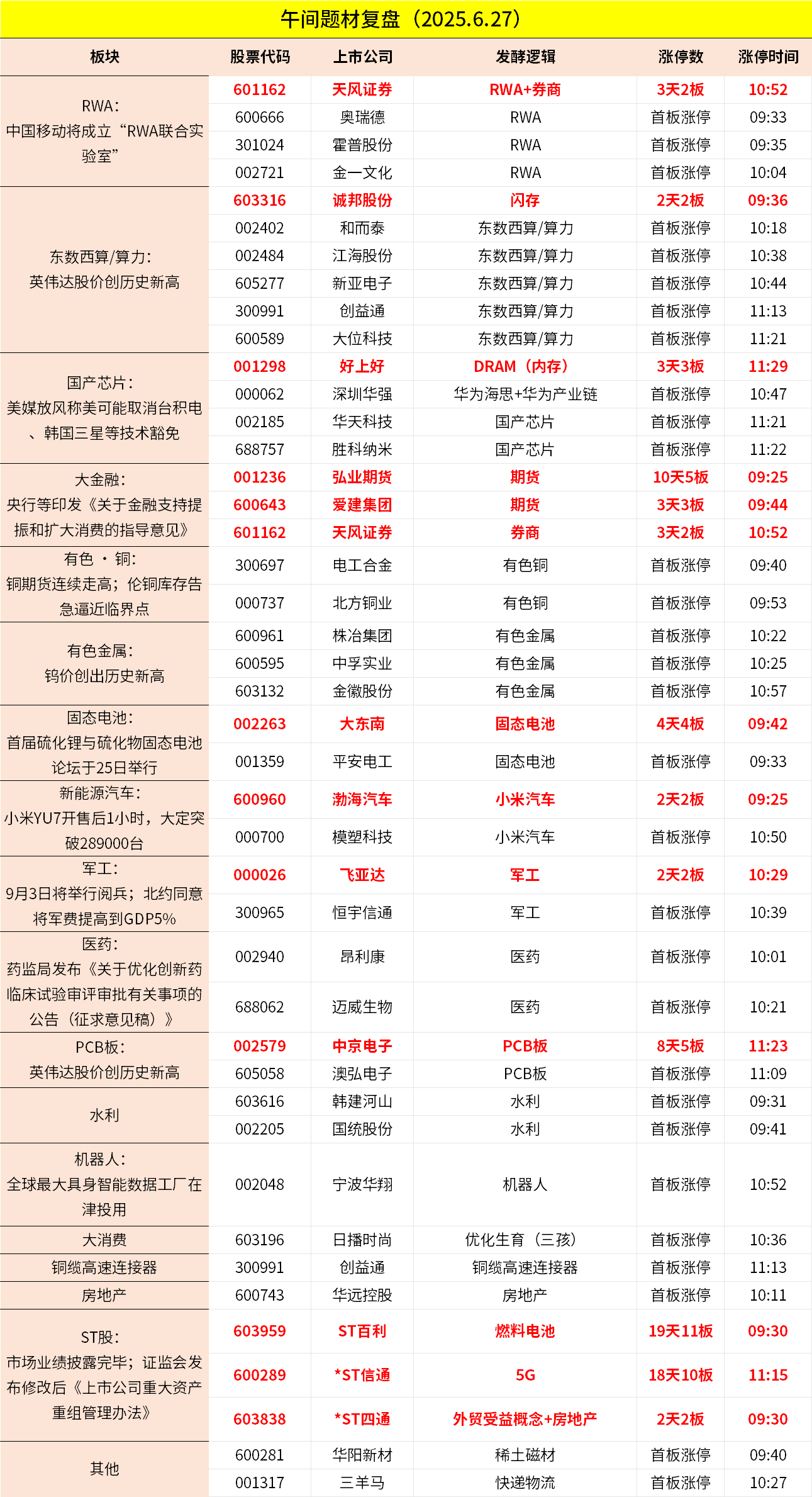1、市场早间震荡分化,沪指冲高回落,创业板指涨超1%。算力硬件股再度走强,创意通、新亚电子、华天科技涨停,胜宏科技、新易盛续创历史新高。有色板块集体拉升,电工合金、北方铜业、金徽股份等封板。大金融板块继续活跃,天风证券、爱建集团、弘业期货涨停。下跌方面,银行板块迎来调整,重庆银行等跌超3%。个股涨多跌少,沪深京三市近3800股飘红,上午半天成交1.01万亿。午间收盘沪指跌0.21%,深成指涨0.85%,创业板涨1.16%。
