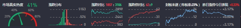 3、两市共1857只个股上涨,62只个股涨停,3106只个股下跌,9只个股跌停,16只股票炸板,炸板率23%。