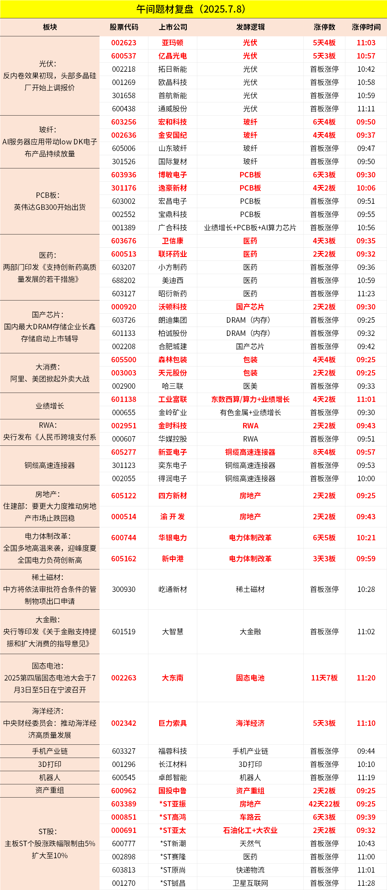 1、市场早间震荡拉升,沪指逼近3500点关口,创业板指涨超2%。光伏概念股集体爆发,通威股份、欧晶科技、拓日新能等多股涨停。PCB等算力硬件方向继续走强,工业富联、逸豪新材、得润电子等10余股涨停。创新药概念延续强势,美迪西、昭衍新药、联环药业等涨停。个股涨多跌少,沪深京三市超3900股飘红,上午半天成交8846亿。午间收盘沪指涨0.58%,深成指涨1.27%,创业板涨2.25%。