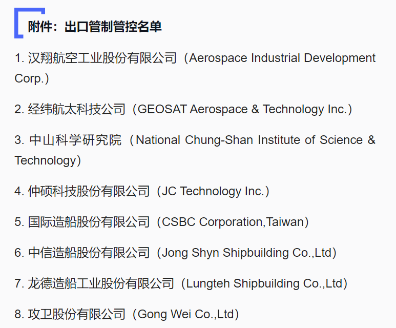 今天,商务部将8家台湾地区实体列入出口管制管控名单。