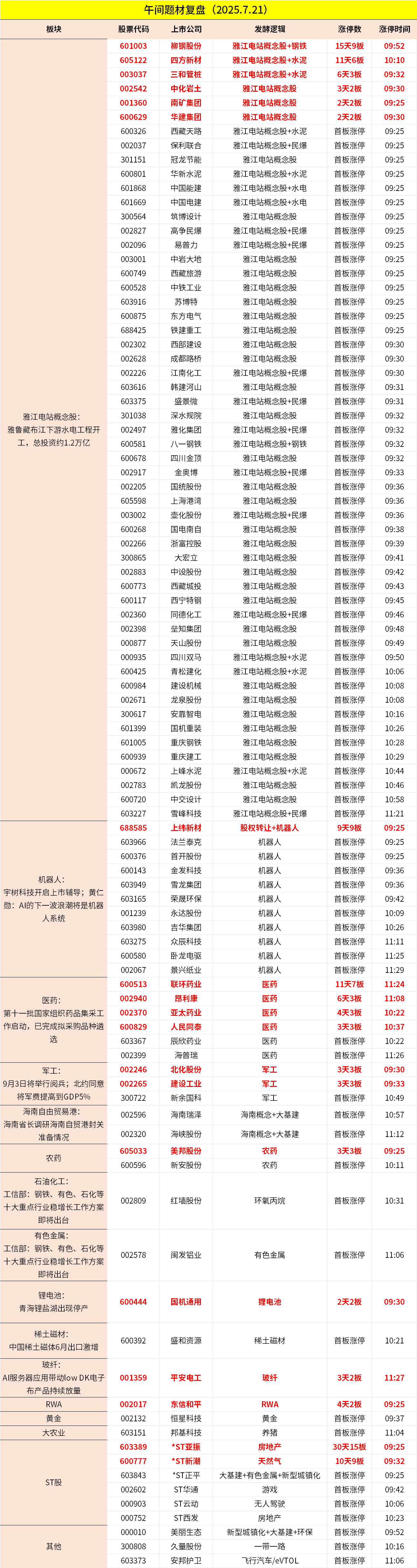 1、市场早间红盘震荡,三大指数小幅上涨。大基建板块集体爆发,超级水电方向领涨,中国电建、中国能建、西藏天路等多股涨停。机器人概念股反复活跃,上纬新材、景兴纸业、卧龙电驱等多股封板。医药股延续强势,联环药业、亚太药业、昂利康等涨停。下跌方面,跨境支付概念走低,四方精创跌超5%。个股涨多跌少,沪深京三市近3600股飘红,上午半天成交1.1万亿。午间收盘沪指涨0.44%,深成指涨0.29%,创业板涨0.12%。