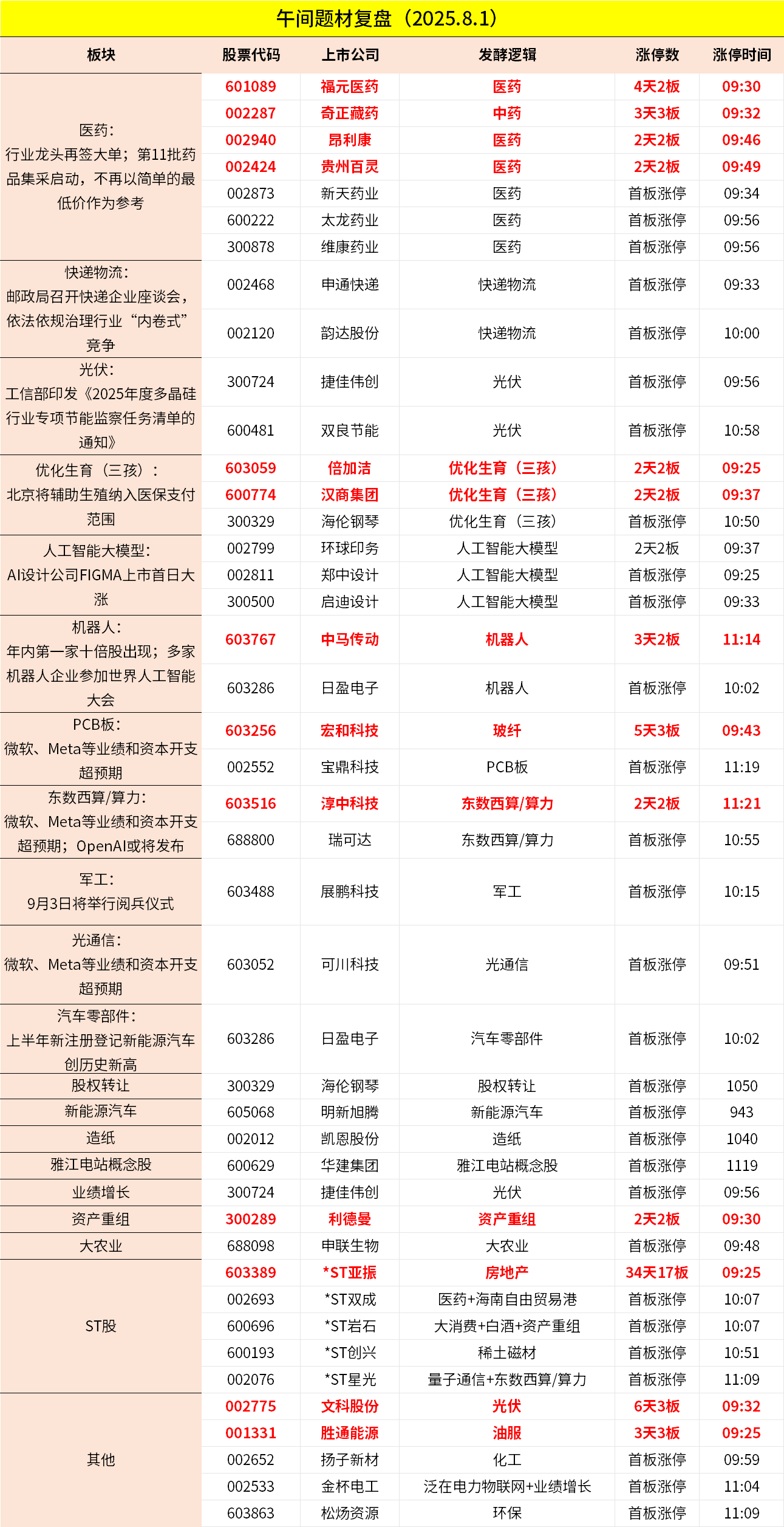 市场早间冲高回落,三大指数小幅下跌。医药股延续强势,奇正藏药、福元医药等多股涨停。光伏板块集体拉升,捷佳伟创、双良节能涨停。快递物流股走高,申通快递、韵达股份封板。下跌方面,体育概念股走低,共创草坪跌停。个股涨多跌少,沪深京三市超3100股飘红,上午半天成交1.01万亿。午间收盘沪指跌0.19%,深成指跌0.15%,创业板跌0.16%。