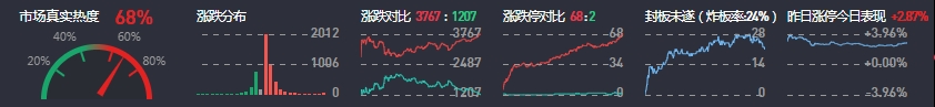 3、两市共3767只个股上涨,68只个股涨停,1207只个股下跌,2只个股跌停,18只股票炸板,炸板率24%。