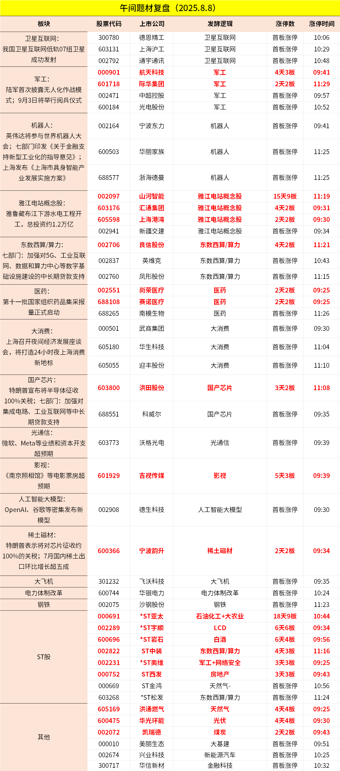 1、市场早间低开高走,三大指数小幅上涨。雅江水电概念集体走强,山河智能、新疆交建等多股涨停。商业航天概念拉升,上海沪工、通宇通讯等封板。医疗器械板块盘中活跃,赛诺医疗、尚荣医疗涨停。下跌方面,AI智能体概念调整,金现代、鼎捷数智跌超10%。个股依旧跌多涨少,沪深京三市近3000股飘绿,上午半天成交1.09万亿。午间收盘沪指涨0.07%,深成指涨0.14%,创业板涨0.21%。