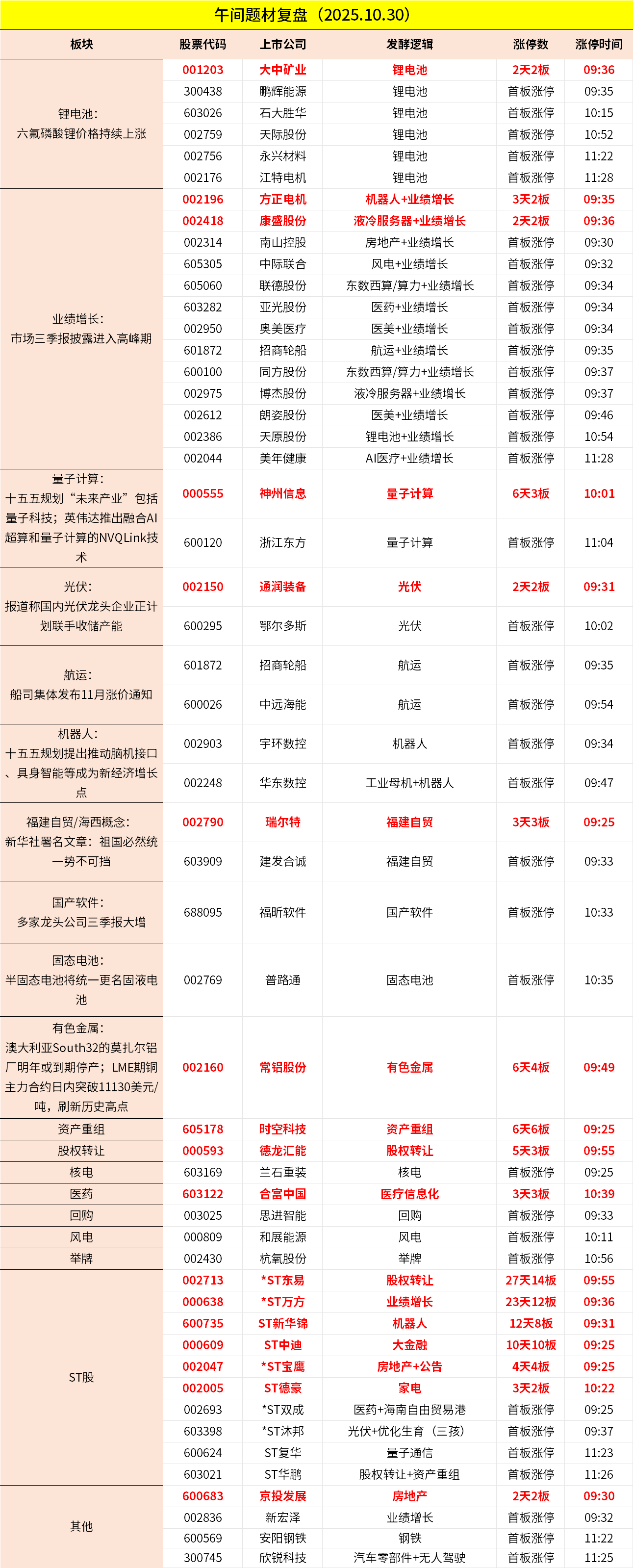 1、市场早间探底回升,三大指数涨跌互现。量子科技概念持续爆发,国盾量子、神州信息等多股涨停。锂矿股集体走强,永兴材料、大中矿业等涨停。港口航运板块表现活跃,招商轮船、中远海能涨停。储能板块延续强势,通润装备2连板。下跌方面,CPO概念股集体调整,天孚通信跌超9%。个股跌多涨少,沪深京三市超3200股飘绿,上午半天成交1.56万亿。午间收盘沪指涨0.06%,深成指跌0.02%,创业板跌0.23%。