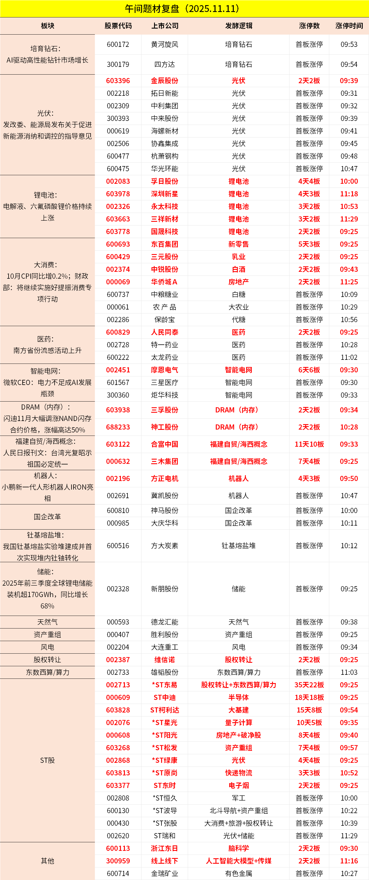 1、市场早间高开低走,三大指数集体调整。超硬材料概念逆势大涨,四方达、黄河旋风涨停。光伏板块集体走强,中来股份、国晟科技等封板。锂电池板块再度拉升,永太科技、方大碳素等涨停。下跌方面,煤炭板块走低,安泰集团跌超5%。个股涨多跌少,沪深京三市超2900股飘红,上午半天成交1.27万亿。午间收盘沪指跌0.38%,深成指跌0.52%,创业板跌0.74%。