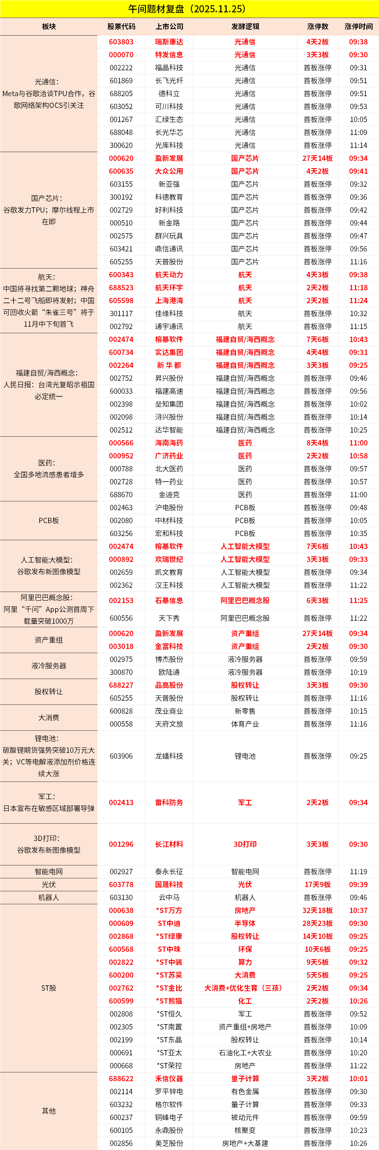 1、市场早间高开高走,深成指、创业板指均涨超2%。算力硬件股集体爆发,德科立、光库科技等多股涨停。AI应用概念再度走强,实达集团4连板,榕基软件7天6板。抗流感概念表现活跃,广济药业2连板,特一药业、北大医药涨停。商业航天概念拉升,航天环宇、上海港湾等涨停。下跌方面,水产股集体调整,中水渔业、獐子岛触及跌停。个股涨多跌少,沪深京三市超4800股飘红,上午半天成交1.18万亿。午间收盘沪指涨1.13%,深成指涨2.04%,创业板涨2.6%。