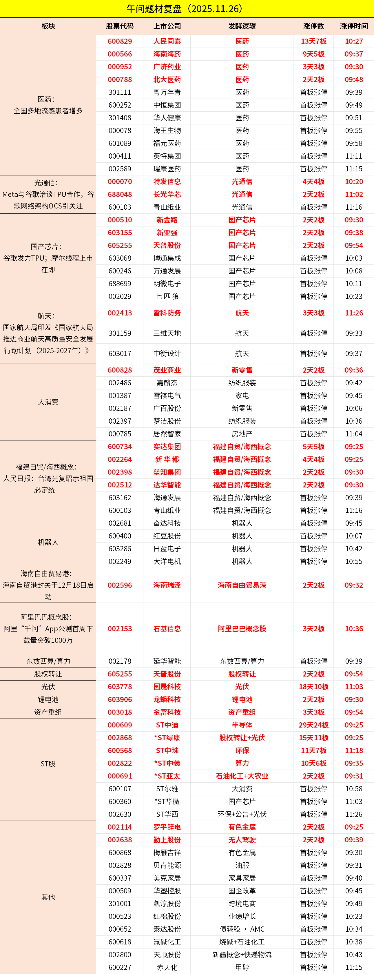 1、沪指早间窄幅震荡,创业板指涨超2%。CPO等算力硬件股走强,中际旭创大涨超13%,股价创历史新高,特发信息4连板,新易盛涨超10%。医药股集体走强,广济药业3连板,北大医药2连板。下跌方面,军工板块迎来调整,久之洋、晨曦航空跌超10%。个股涨多跌少,沪深京三市超2800股飘红,上午半天成交1.14万亿。午间收盘沪指涨0.14%,深成指涨1.61%,创业板涨2.76%。