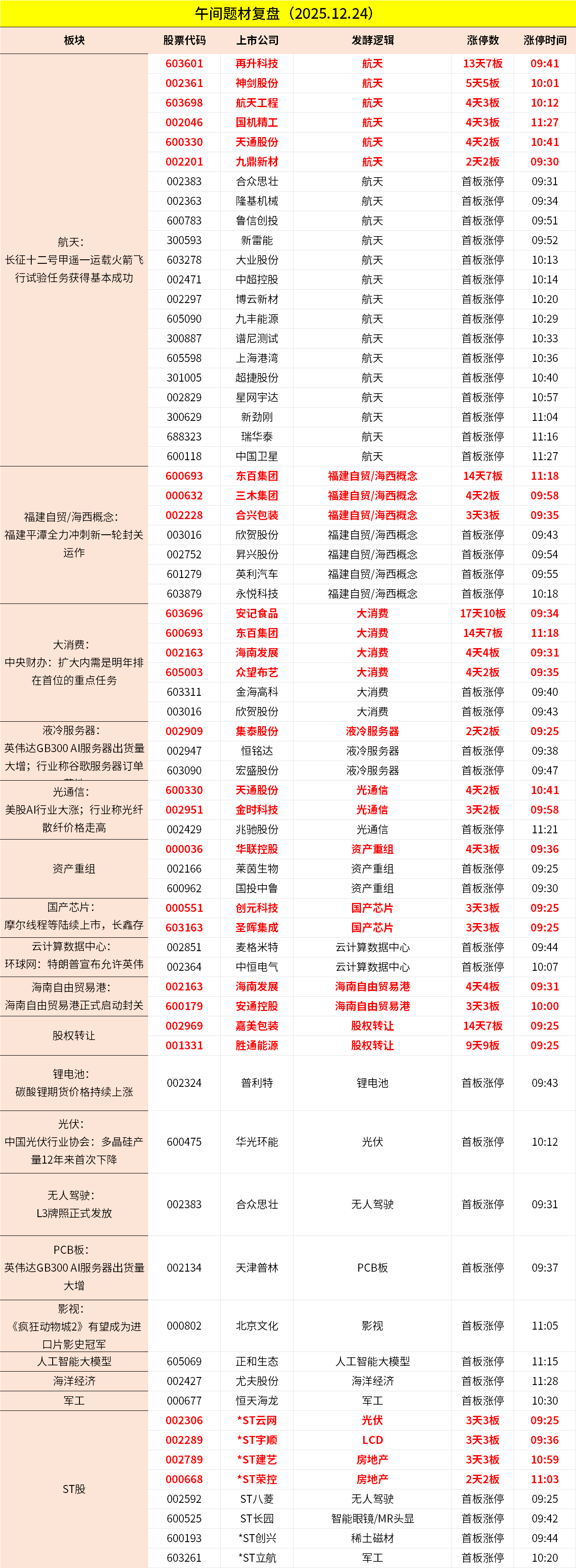 1、市场早间横盘震荡,三大指数小幅上涨。商业航天概念再度爆发,神剑股份5连板,超捷股份、星网宇达等近20股涨停。AI硬件股反复活跃,数据中心电源、液冷方向领涨,麦格米特、宏盛股份等涨停。福建板块走强,东百集团、安记食品等涨停。下跌方面,乳业股下挫,庄园牧场跌近8%。个股涨多跌少,沪深京三市超3800股飘红,上午半天成交1.16万亿。午间收盘沪指涨0.24%,深成指涨0.31%,创业板涨0.08%。