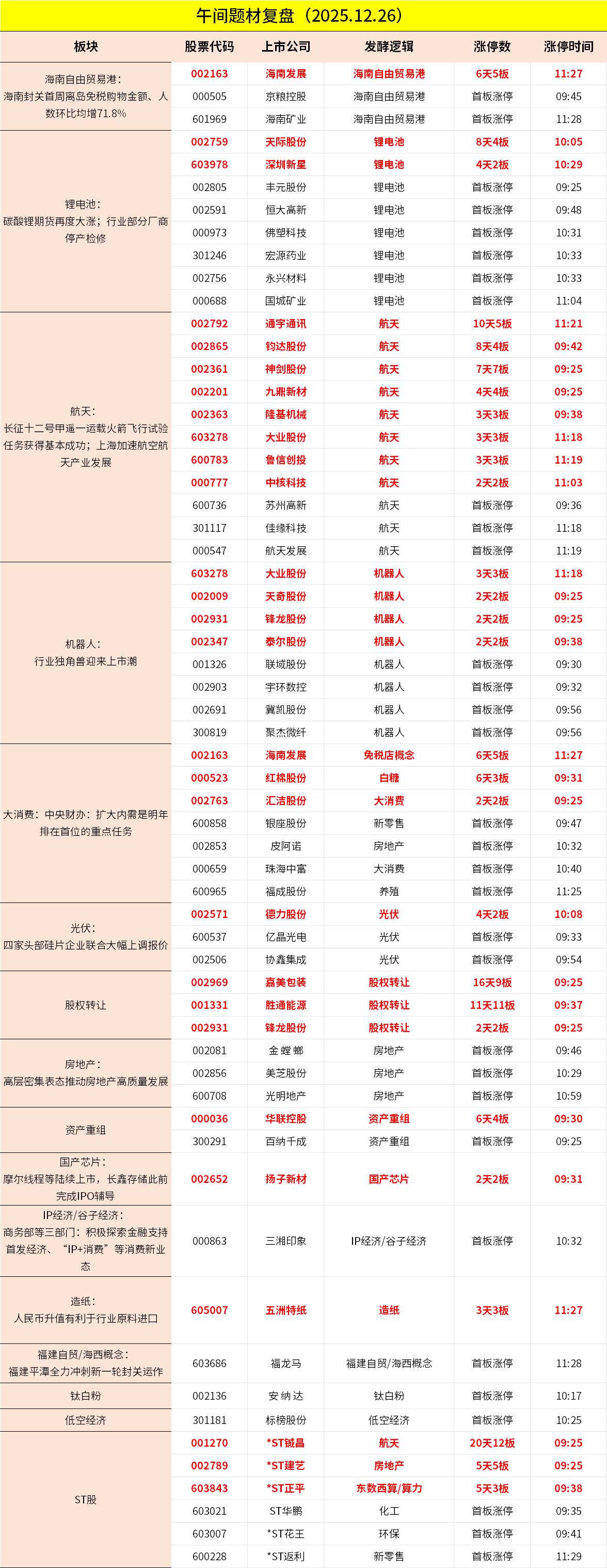 2、板块概念方面,海南、锂矿、贵金属、商业航天等板块领涨;造纸、光刻机、白酒、算力硬件等方向跌幅居前;
