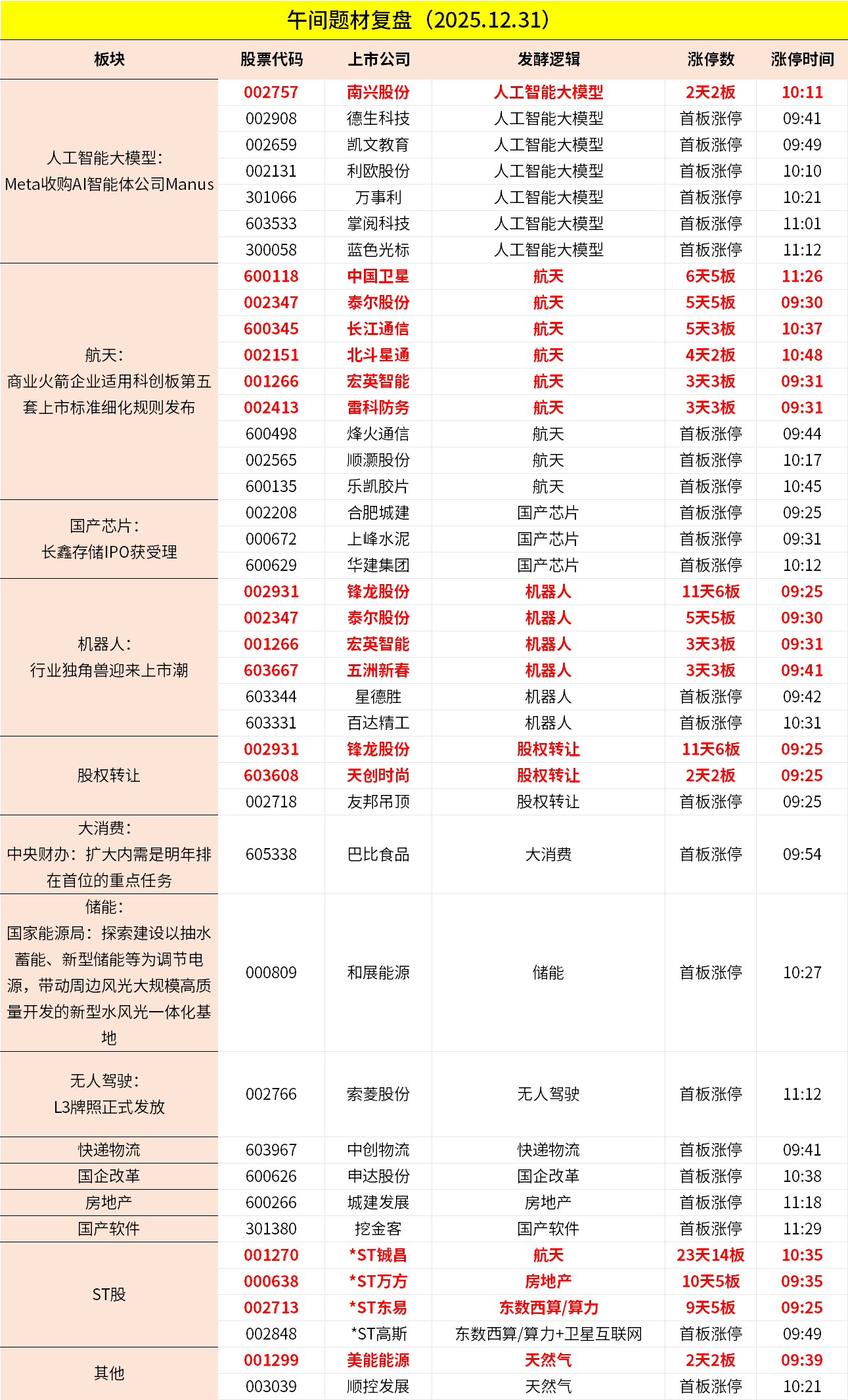 1、市场早间震荡调整,创业板指跌超1%。AI应用端再度大涨,蓝色光标、南兴股份等多股涨停。商业航天概念延续强势,航天晨光、北斗星通等近10股涨停。 长鑫存储概念表现活跃,合肥城建、上峰水泥等涨停。下跌方面,液冷服务器概念下挫,川润股份跌超8%。个股跌多涨少,沪深京三市超3000股飘绿,上午半天成交1.33万亿。午间收盘沪指跌0.07%,深成指跌0.67%,创业板跌1.1%。