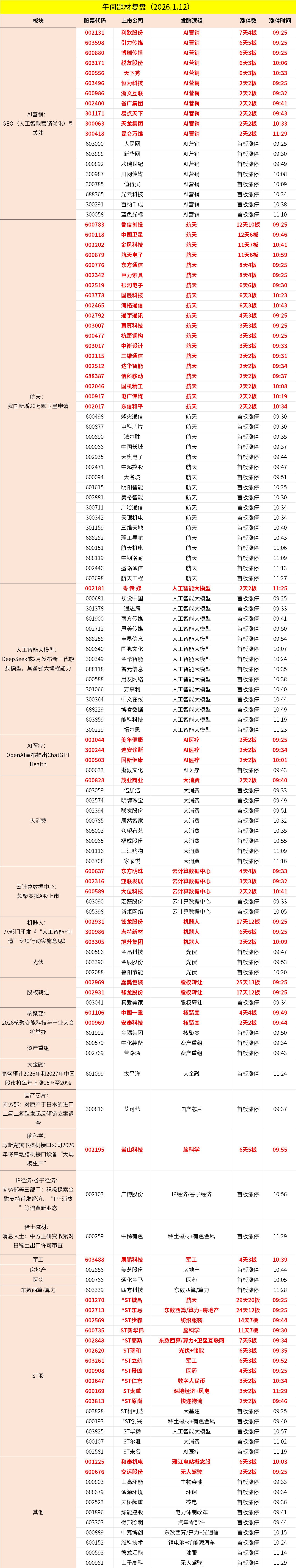 1、沪指早间震荡走强,继续刷新十年多新高,深成指、创业板指均涨超1%。AI应用方向持续爆发,GEO、AI医疗方向领涨,值得买、光云科技等多股涨停。商业航天概念延续强势,中国卫星、金风科技等多股封板。零售概念走高,三江购物、家家悦等涨停。个股涨多跌少,沪深京三市超3800股飘红,上午半天成交2.33万亿。午间收盘沪指涨0.75%,深成指涨1.31%,创业板涨1.17%。