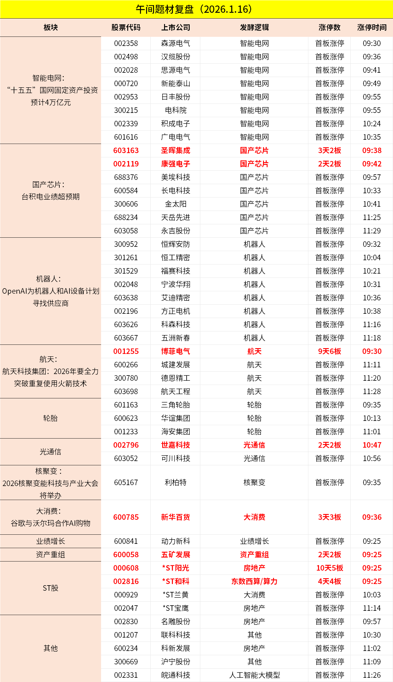 1、市场早间高开回落,三大指数集体翻绿。机器人概念股走强,恒工精密、方正电机等多股涨停。电网设备股集体爆发,思源电气、积成电子等封板。半导体芯片股延续强势,康强电子2连板,佰维存储涨超10%创新高。下跌方面,AI应用方向集体调整,引力传媒、视觉中国等多股跌停。个股跌多涨少,沪深京三市超3300股飘绿,上午半天成交2.01万亿。午间收盘沪指跌0.22%,深成指跌0.1%,创业板跌0.01%。