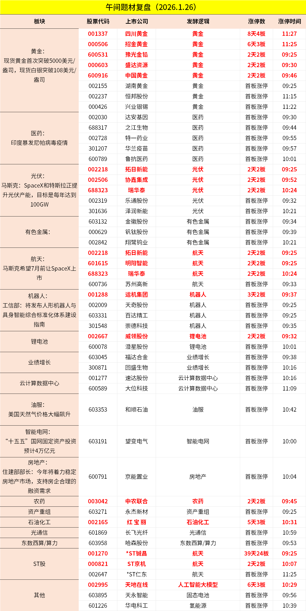 1、沪指早间宽幅震荡,创业板指走势较弱。贵金属板块爆发,四川黄金、中国黄金等多股涨停。油气股集体拉升,通源石油涨超10%,中国海油、中国石油涨超5%。医药、疫苗股活跃,之江生物、特一药业等涨停。下跌方面,商业航天概念调整,博威合金、中国卫星等触及跌停。个股跌多涨少,沪深京三市超3700股飘绿,上午半天成交2.26万亿。午间收盘沪指涨0.12%,深成指跌0.74%,创业板跌0.86%。