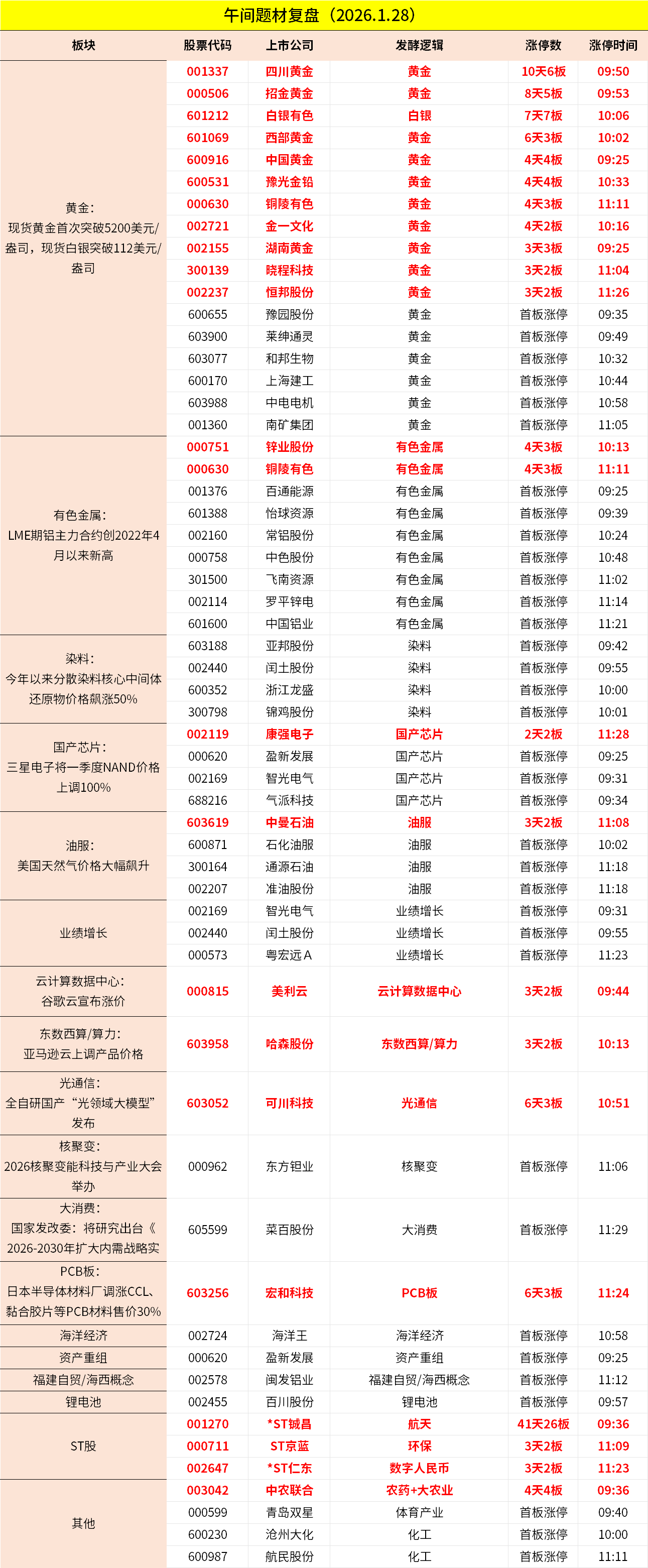1、市场早间震荡分化,三大指数涨跌互现。以黄金为首的资源股集体爆发,四川黄金4连板,招金黄金、湖南黄金3连板;油气股震荡拉升,通源石油、中曼石油等涨停,中国海油涨超7%创新高;有色板块全线走强,中国铝业涨停创16年新高,北方铜业、铜陵有色等多股封板。下跌方面,光伏板块调整,东方日升、迈为股份跌超7%。个股跌多涨少,沪深京三市超3500股飘绿,上午半天成交1.93万亿。午间收盘沪指涨0.49%,深成指涨0.09%,创业板跌0.37%。
