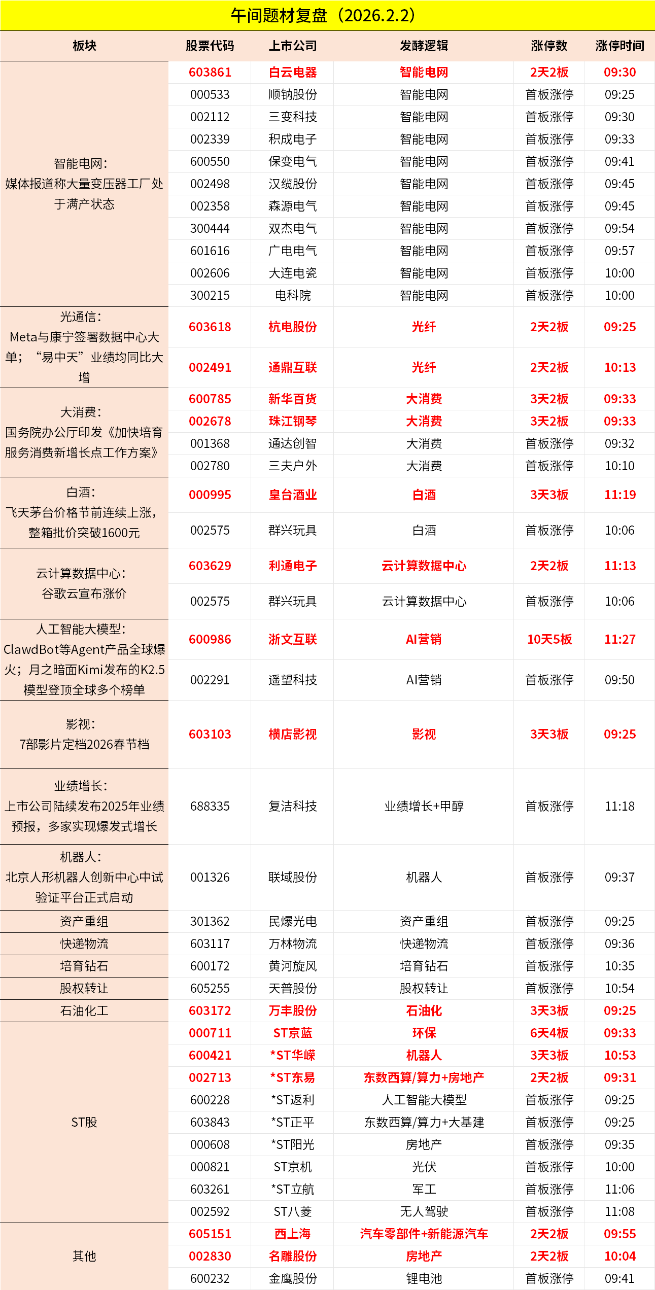 1、市场早间震荡调整,三大指数均跌超1%。电网设备板块逆势大涨,积成电子、白云电器等多股涨停。白酒股再度走强,皇台酒业3连板,水井坊触及涨停。下跌方面,资源股集体调整,贵金属、油气方向领跌,四川黄金、中金黄金、中曼石油、准油股份等多股跌停。半导体芯片股下挫,闻泰科技、太极实业等跌停。个股跌多涨少,沪深京三市超3400股飘绿,上午半天成交1.66万亿。午间收盘沪指跌1.32%,深成指跌1.41%,创业板跌1.18%。