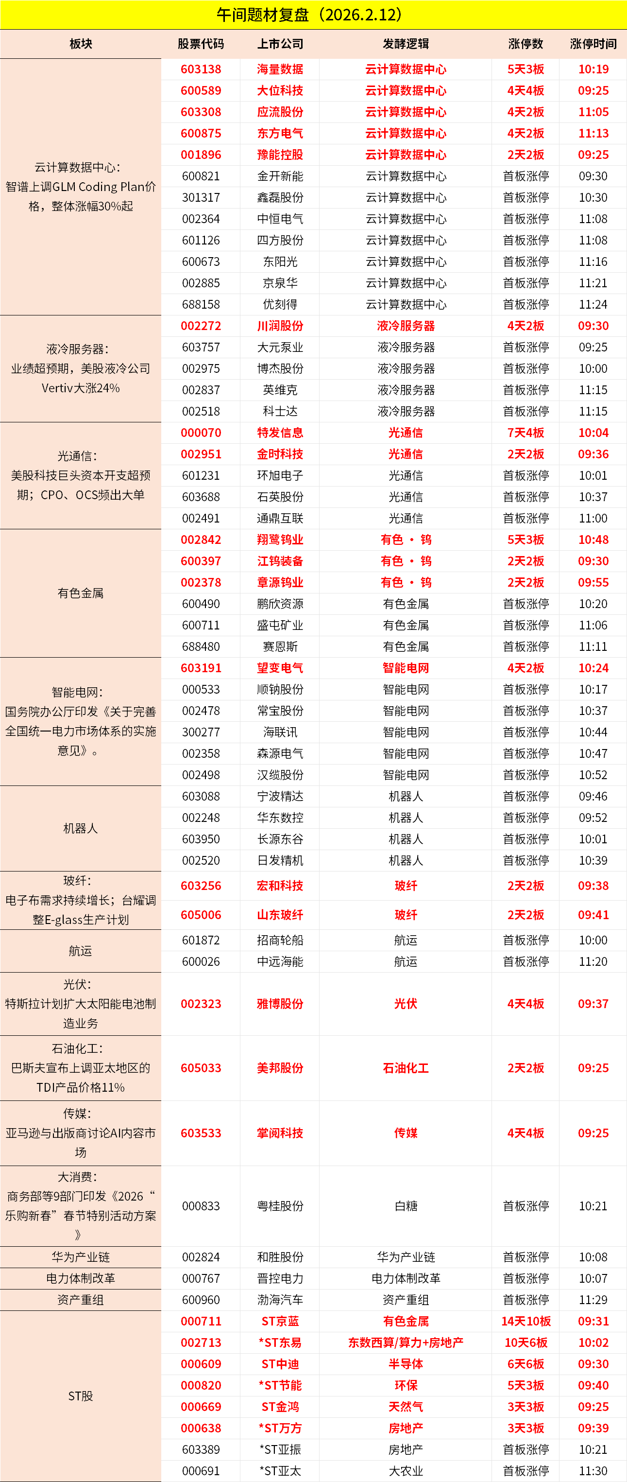 1、沪指早间窄幅震荡,创业板指涨超1%。算力产业链集体走强,数据中心电源方向,东方电气、中恒电气等涨停,液冷服务器方向,川润股份、英维克等涨停,CPO方向,太辰光、天孚通信涨超10%创新高。有色金属板块反复活跃,翔鹭钨业5天3板,章源钨业2连板。下跌方面,影视股延续调整,横店影视、博纳影业等跌停。个股涨跌互现,上午半天成交1.34万亿。午间收盘沪指涨0.12%,深成指涨0.81%,创业板涨1.18%。