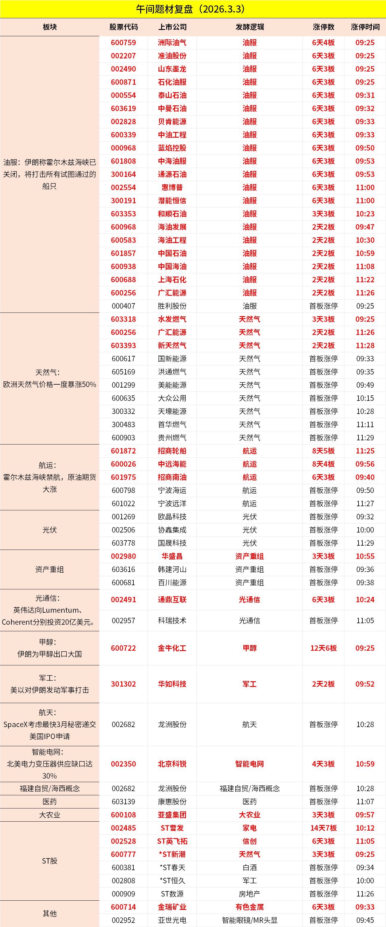 1、市场早间高开低走,三大指数盘中均跌超1%,随后又探底回升。油气股持续爆发,中国石油、中国海油、中国石化等20余股涨停。天然气板块拉升,新天然气、洪通燃气、水发燃气等多股封板。航运板块延续涨势,招商轮船、宁波远洋、中远海能等涨停。下跌方面,军工板块下挫,航亚科技跌超10%;半导体板块走低,圣晖集成跌停。个股跌多涨少,沪深京三市超3800股飘绿,上午半天成交2.03万亿。午间收盘沪指跌0.07%,深成指跌1.05%,创业板跌0.44%。