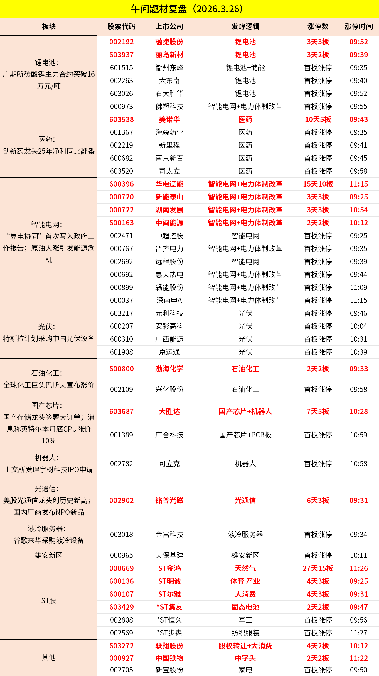 1、沪指早间震荡调整,创业板指冲高回落。锂电池板块逆势走强,融捷股份3连板,丽岛新材、衢州东峰、大东南、石大胜华等涨停。电力板块探底回升,华电辽能9连板,广西能源、京运通、赣能股份、深南电A等多股涨停。下跌方面,光伏板块调整,宇邦新材跌超10%;保险股下挫,中国人寿跌逾5%。个股跌多涨少,沪深京三市超4100股飘绿,上午半天成交1.23万亿。午间收盘沪指跌0.58%,深成指跌0.38%,创业板跌0.07%。
