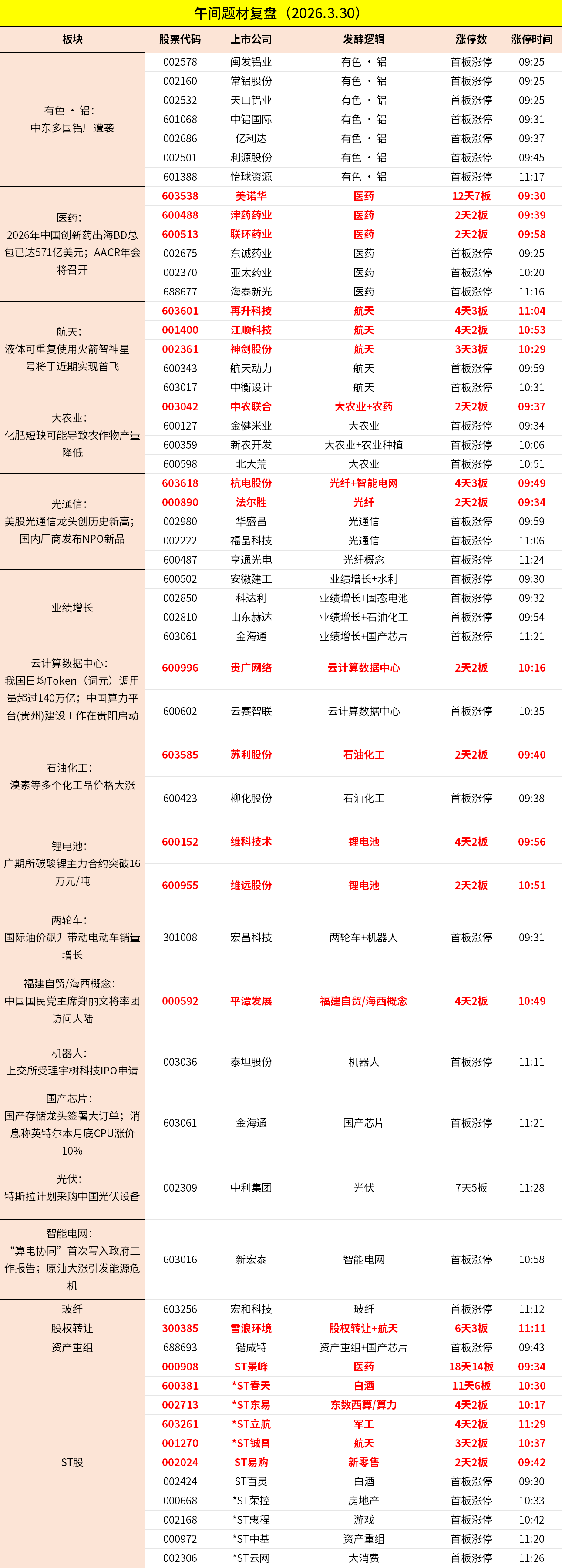 1、市场早间探底回升,沪指拉升翻红,深成指、创业板指跌幅收窄。有色铝概念股开盘大涨,闽发铝业、天山铝业、常铝股份等多股涨停。农业股集体走强,金健米业、新农开发、北大荒等涨停。创新药概念延续强势,美诺华5连板,津药药业、联环药业等涨停。商业航天概念反复活跃,神剑股份3连板,再升科技、航天动力等涨停。下跌方面,电力股集体调整,华电辽能、晋控电力、华电能源等多股跌停。个股涨跌互现,上午半天成交1.33万亿。午间收盘沪指涨0.23%,深成指跌0.12%,创业板跌0.5%。