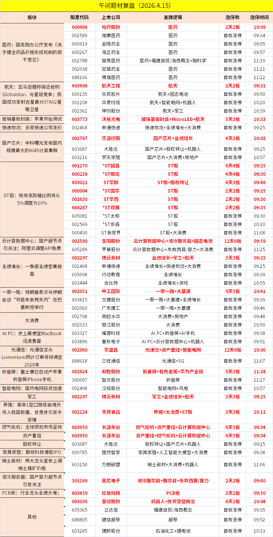 1、沪指早间红盘震荡,创业板指高开低走。创新药概念集体走强,博瑞医药、海正药业、金陵药业等多股涨停。商业航天概念延续涨势,航天工程、华菱线缆、神剑股份等涨停。玻璃基板封装概念反复活跃,沃格光电涨停创新高。下跌方面,油气股下挫,美能能源盘中触及跌停;锂电池板块调整,海科新源跌超10%。个股跌多涨少,沪深京三市超2800股飘绿,上午半天成交1.59万亿。午间收盘沪指涨0.37%,深成指跌0.25%,创业板跌0.23%。